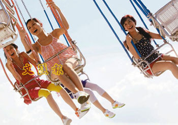 3号张舒雅(左)玩“星际蜘蛛”,吓得面青唇白,大叫“我好怕呀!”。(图片来源:文汇报)