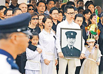 资料图:香港尖沙咀枪击案殉职警员曾国恒,以警队最高规格举行丧礼,仪式于世界殡仪馆举行,由曾国恒生前的同袍扶灵。 中新社发 谭达明 摄