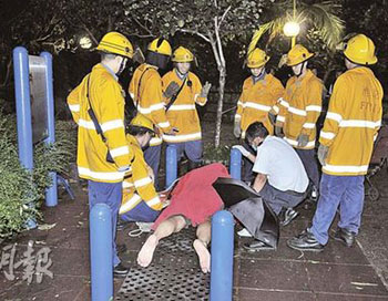 中新网8月8日电 据香港明报报道,香港一名中年男子在3号风球下冒雨到蓝田碧云道公园观景台上做运动,当他俯伏在仰卧起坐板时,呈充血状态的阳具离奇困在1寸直径的圆孔内,无法拔出只好报警求助。