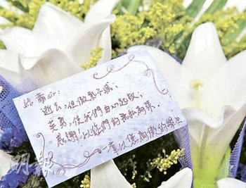 一群曾经由殉职消防队员萧永方训练的消防学员,献上鲜花及写有“逝去但傲气不灭”等字句的心意卡,向萧永方致敬及表示怀念。(图片来源:明报)