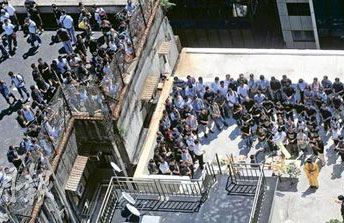 香港救人英雄萧永方及陈兆龙不幸殉职,约170人14日到火场招魂致祭,由于人数太多,各人分别站到发生火警的嘉禾大厦(右)及永如大厦(左)天台,列队向英灵上香致意。(图片来源:明报)