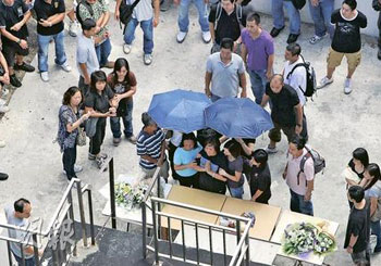 殉职消防员陈兆龙的母亲(伞下合十者)到嘉禾大厦天台拜祭爱儿。另一殉职消防队员萧永方的妻子,则由亲友搀扶,等候向丈夫致祭。(图片来源:明报)