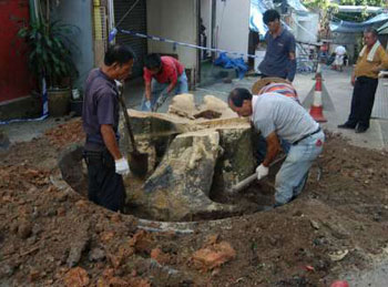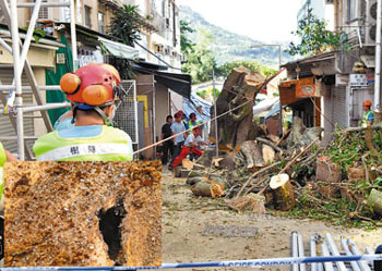 由于树干直径粗近两尺,工人要锯成片状,再写上编号运走,等待日后重组树型追查被侵蚀和倒塌原因。部分树干的中央位置被虫蛀出现“空心”,大量类似蚂蚁的昆虫因巢穴被毁爬行而出。