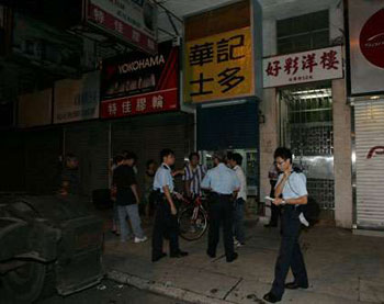 香港警方在发生劫案的小店外调查。(图片来源:大公报)