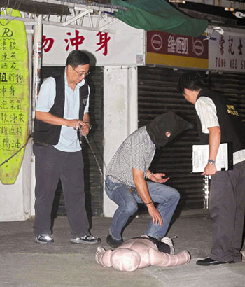 晚上7时45分,另一名身高穿灰黑色间条T恤及牛仔裤、身高约6尺的疑犯,也被重案组探员以黑头套蒙头,及带同一个假人押回现场,在案发小店对面空地重组案情。其间疑犯曾以拳头向假人作袭击状,探员则在旁录像,一行人逗留约半小时才离去。