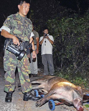 中新网9月19日电 据香港大公报报道,18日,一头野猪闯入香港元朗牛潭尾民居,爆发“人猪大战”。一头重200斤的野猪进村觅食时受惊,误闯村屋空地,户主及街坊等四人分持斧头、犁耙合力捕捉,结果三人受伤,最后将野猪困锁在厕所。警员接报赶至封锁现场,狩猎队入村将野猪射杀。