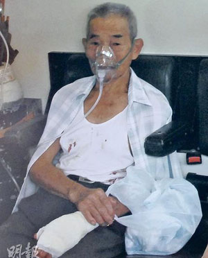 年迈的陈父左手腕受伤,在场接受包扎后送院治理。(图片来源:明报)