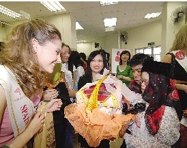 来自世界各地的63位佳丽29日上午10时,到澳门扶康宝翠中心作亲善探访。一众佳丽欣赏了由扶康学员表演的葡萄牙土风舞,并向学员赠送悉心准备的小礼物,部分学员被佳丽的诚意所打动,流下开心的泪水。