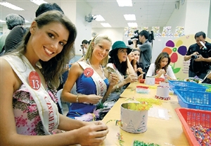 国际小姐候选佳丽到扶康中心参观,顺道制作手工艺品,向弱势社群送上一份关怀。(图片来源:澳门日报)