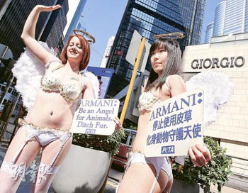 中新网11月26日电 据香港《明报》报道,惯以性感女郎进行抗议活动的“善待动物组织”,25日派出两名仅穿内衣的“动物守护天使”,到香港中环置地广场一间时装名店外抗议。