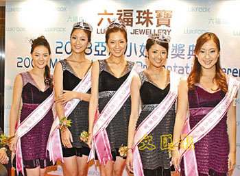 中新网12月11日电 据香港《文汇报》报道,五位新鲜“出炉”的亚洲小姐:冠军姚佳雯、亚军颜子菲、季军赖琳恩及两位友谊小姐姚凤凤与林淑蓉,10日到香港北角珠宝首饰赞助商门巿领奖。