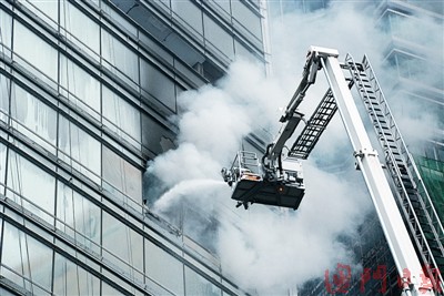 消防员接报到场时,起火楼层火势异常猛烈,两落地玻璃抵受不住热力爆裂,碎片横飞,火舌四射。消防员即进入火场射水灌救,搜索被困工人,并升起云梯向起火房间的外部射水灌救。