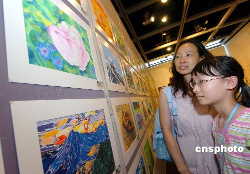 12岁的香港学生吴绮雯和她的母亲在七月末香港大会堂展出的儿童画展上,认真地欣赏展出的作品。有八年画龄的她,平日喜欢画自然风光,此次她送展的作品是一幅灿烂的牡丹花。此次数百幅儿童作品涉及内容无奇不有,从大自然的风光美景到街市商业景象,透视出孩子们眼中的多彩世界。中新社发 王丽南 摄