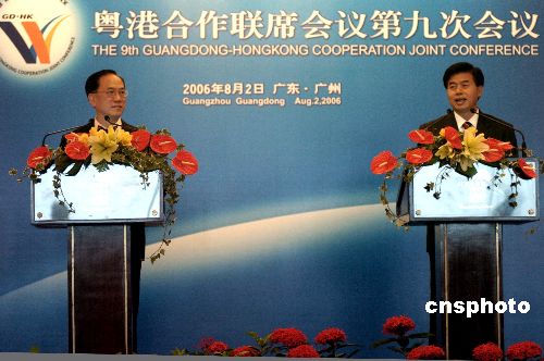 八月二日下午,香港特区行政长官曾荫权与广东省省长黄华华在广州白天鹅宾馆联合举行新闻发布会,介绍粤港合作联席会议第九次会议的成果。中新社发 柯小军 摄