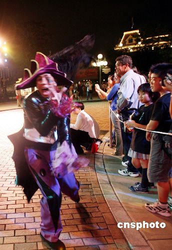 香港迪斯尼乐园在9月30日至10月31日期间举办“万圣节”活动,希望让游客体验西方节日的不同味道。图为入夜后的迪斯尼乐园热闹非常。中新社发 洪少葵 摄