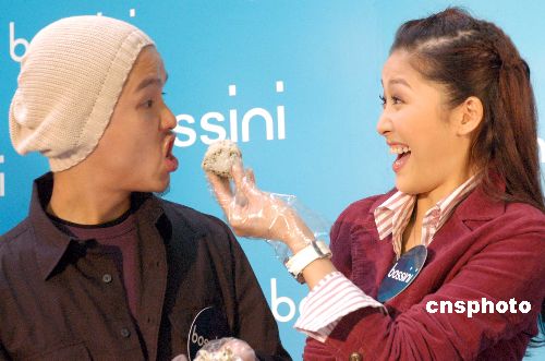香港歌星周丽淇11月6日在香港出席一便服品牌举行“Bossini 11月瀛到飞起”推广活动记者会,她与另一位担任“瀛人地标”的陈方藤合作示范制造日式饭团后,陈方藤作势吃掉周丽淇亲手制作的饭团。中新社发 邓庆乐 摄