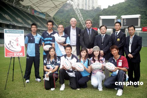 11月23日,香港榄球总会与无线电视台达成香港国际七人榄球赛播映合作协议,无线电视将连续3年为该赛事作独家现场转播。图为香港榄球总会会长郭嘉利“右四”与无线电视市场及营业部总监梁健华“右三”及一众艺员嘉宾出席签约仪式。中新社发 洪少葵 摄