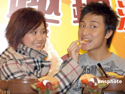 香港歌星方力申、杨爱瑾11月29日在香港出席一品牌快餐连锁店推出新菜式举行宣传活动,并品尝试食。中新社发 邓庆乐 摄