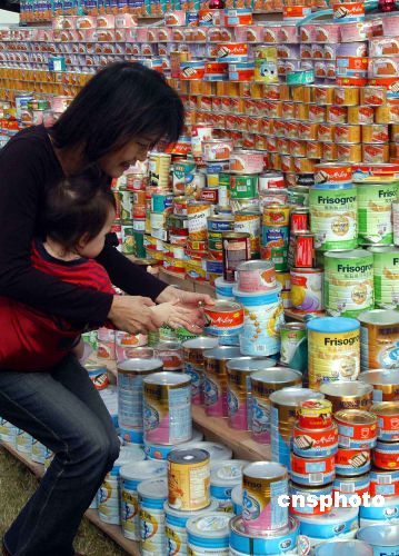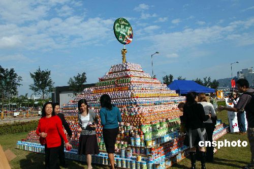 香港市民30日响应圣雅各福群会的“一人一罐头”运动,将罐头堆成食物树。中新社发 谭达明 摄