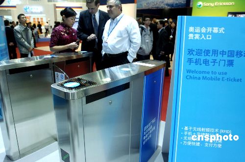 12月4日至9日在香港举办的世界电信展上﹐中国移动公司展示2008北京奥运会开幕式贵宾入口手机电子门票系统﹐一些外商仔细询问工作人员有关情况。此系统利用手机加非接触的IC卡技朮﹐方便﹑环保﹑保密。据透露﹐人们期待已久的3G技朮届时将会在北京奥运会上使用。中新社发 王丽南 摄