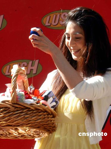 香港明星杨釆妮5日在世贸中心,宣传她为一品牌设计的慈善购物袋。中新社发 谭达明 摄