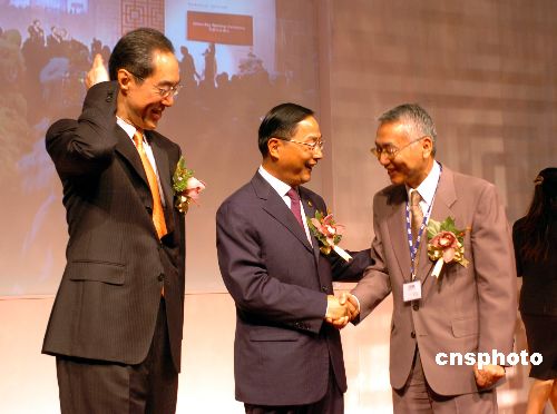 国家信息产业部﹑香港政府工商及科技局﹐5日在香港世界电信展上举办“中国日”活动﹐以充分利用国际电信联盟2006世界电信展提供的平台作国际交流。国家信息产业部蒋耀平副部长〔中〕﹑香港政府财政资司唐英年司长〔左〕﹑国际电信联盟秘书长内海善雄先生出席活动。中新社发 宋吉河 摄