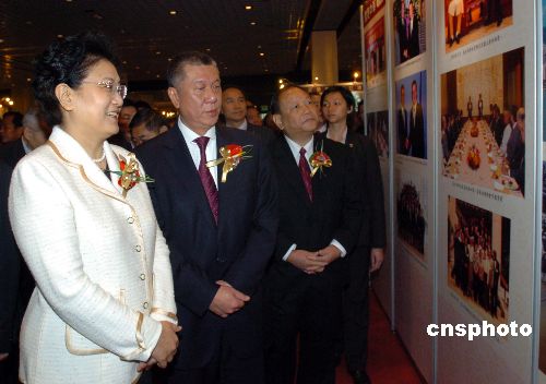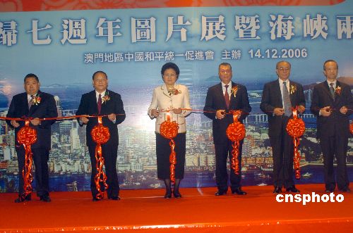 十二月十四日,全国政协副主席、中央统战部部长刘延东、澳门特首何厚铧、中央人民政府驻澳门联络办公室主任白志健在澳门东亚运体育馆参观“澳门回归七周年图片展”。中新社发 史利 摄