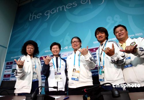 当地时间12月15日中午,香港代表团在多哈亚运会新闻中心举行记者会,香港民政事务局常任秘书长林郑月娥(左)、港协奥委会主席霍震霆,欣喜地向传媒介绍香港代表队在多哈亚运会共获得6金12银10铜,取得历来最佳成绩。 中新社发 洪少葵 摄