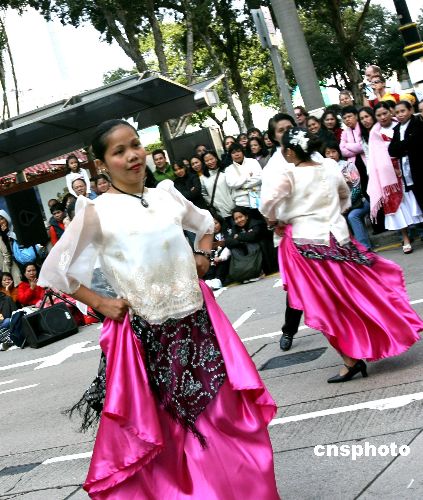 数千在香港从事家政服务的菲律宾青年在大会堂前的马路上集会,表演节目,自娱自乐,欢庆新年到来。据介绍,有几十万菲籍青年在香港打工,从事家政工作,每逢节假日,大街上随处可见她们三五成群的身影。中新社发 王丽南 摄