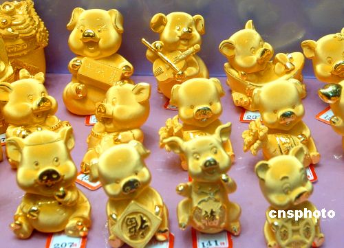中国农历生肖猪年将至﹐香港造型生动的金猪在金银首饰店橱窗里粉墨登场﹐这些憨厚可爱的金猪在自己的本命年里彰显肥态﹐实属当仁不让。人们正面对这片金色迈入财运亨通﹑祥和富足的猪年。中新社发 宋吉河 摄