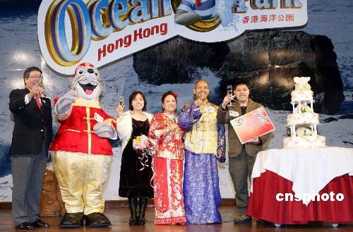 香港万氏伉俪(右二,三)1月7日携儿(右)、女(左三)重返香港海洋公园,共证他俩30年的爱情盟誓,庆祝珍珠婚。万氏夫妇1977年1月结婚,适逢香港首间主题公园--海洋公园开幕,当年两口子在此公园共渡蜜月。中新社发 蔡蔓莉 摄