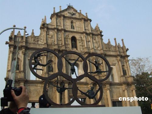 “二00八奥运景观雕塑国际巡展”近日在澳门大三巴牌坊前展出,一百多件奥运题材的雕塑作品把体育、文化和旅游融合在一起,让“人文奥运”贴近澳门,让澳门市民感受奥林匹克精神。中新社发 史利 摄