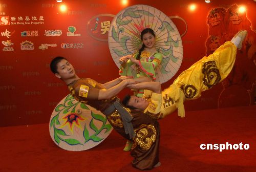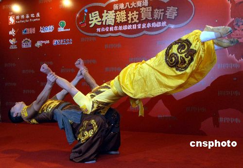 河北省杂技团5日在香港记者会上献技。他们将于新春期间在本港8个商场表演,以其精湛的吴桥杂技,向市民拜年庆新岁。中新社发 谭达明 摄
