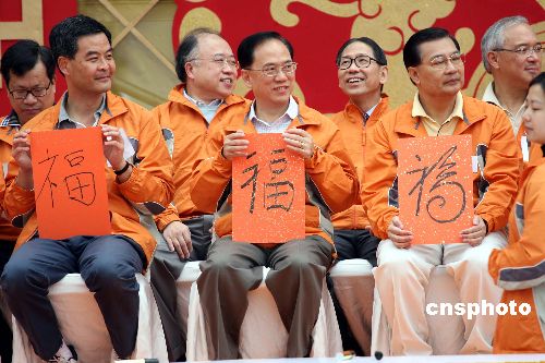 2月11日,香港行政长官曾荫权(中)、立法会议员谭耀宗(右)、行政会议成员梁振英,在小西湾运动场带领万名观众写“福”字,为《齐心 香港高飞》大行动拉开序幕。由香港一群社会精英团结发起的《齐心 香港高飞》大行动,为致力宣传拼搏、创新、自强的香港精神,众志成城策动全城和应。中新社发 洪少葵 摄