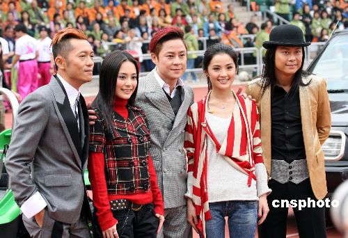 2月11日,香港红歌星Twins姐妹与音乐组合“草蜢”兄弟在小西湾运动场盛装出场,为《香港高飞庆团圆》节目演出。中新社发 洪少葵 摄
