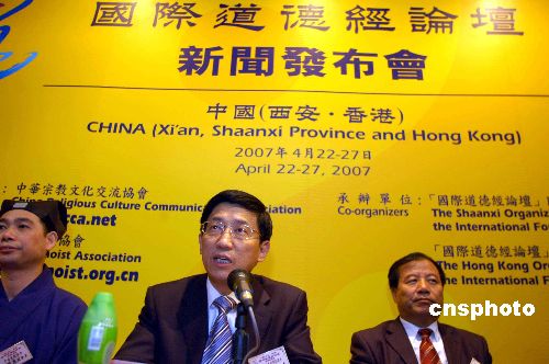 “国际道德经论坛”组委会15日在香港新闻发布会上表示,为弘扬中华优秀传统文化,增进内地与香港、澳门、台湾以及国际间道教文化的交流合作,发挥道教在促进社会和谐方面的积极作用,中华宗教文化交流协会和中国道教协会将于4月下旬在陕西西安和香港举办“国际道德经论坛”。图为中华宗教文化交流协会副会长蒋坚永在会上致辞。中新社发 谭达明 摄