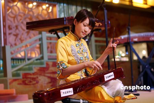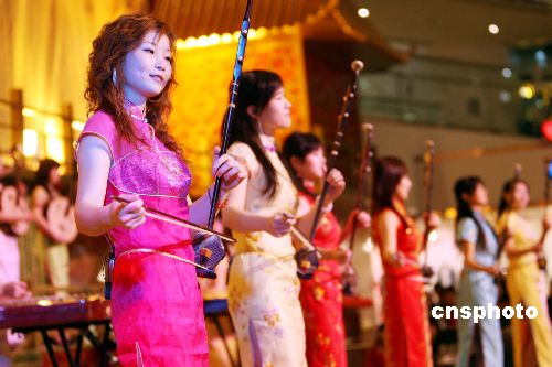2月15日,香港太古城商场邀请到阵容庞大的北京女子中乐团“阳光女孩”来港献艺,“阳光女孩”是21位由中央民族大学音乐学院的优秀学生组成的,她们不但音乐造艺高超,更勇于突破传统,以悦目的旗袍及小凤仙装饰登台。其中曾被张艺谋导演选为“奥运宝贝”的唐小媛,登台演奏罕见的京族乐器-独弦琴,幻化出优美铿锵乐章,技惊四座。中新社发 洪少葵 摄