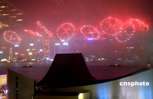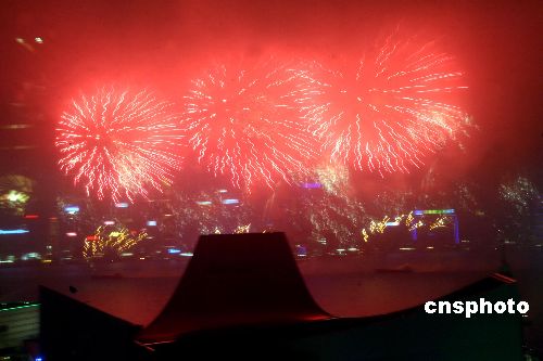 | 香港于大年初二晚在维多利亚海港举行贺岁烟花汇演,烟花然放历时二十三分钟,共分十二幕,由置于海中的三艘趸船发放二万三千八百八十八枚烟花弹。第一幕主题“恭喜发财”,维港上空会出现大红的“吉”字,寓意大吉大利;第三幕的“财神到”,有“8 ”字和“金元宝”图案,像征百事顺景;第四幕“猪笼入水”;最后一幕“粤港大团圆”。烟花由香港广东各级政协委员联谊会,以及烟火制作公司赞助。警方估计有五十万市民及游客在维港两岸观赏。中新社发 王丽南 摄