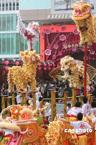 2月21日(年初四),香港海港城举行一年一度的新春舞龙及醒狮庆典,庆贺新禧。金龙及五头狮子在梅花庄上表演及采青,在热闹的锣鼓声中跳跃翻腾,向顾客和商户拜年。中新社发 洪少葵 摄