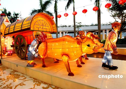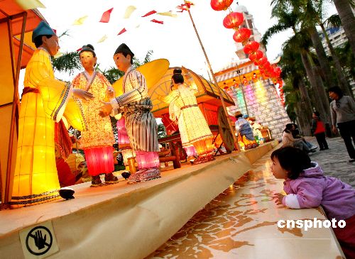 元宵节将至,香港康乐文化署在市区举行三个大型彩灯会,与市民共贺元宵佳节。图中位于香港文化中心广场的大型彩灯展览“灯映名城.相会清明上河图”,已经搭建完成,展露璀灿的容颜。这组设计意念源自名画《清明上河图》,透过色彩鲜艳的花灯及古代景物,活现古都城的繁华璀璨,寓意香港繁荣昌盛。中新社发 王丽南 摄