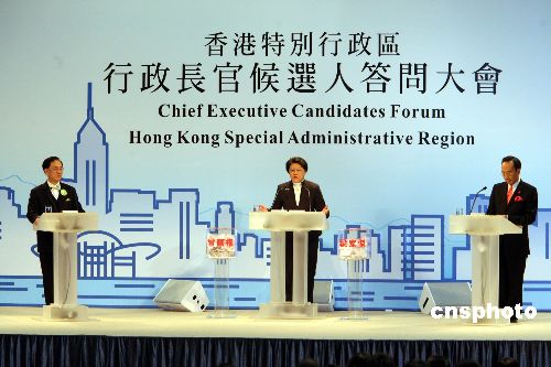 香港“行政长官候选人答问大会”3月1日晚在众人注目中拉开序幕﹐参选连任特首的曾荫权与公民党特首选举参选人梁家杰在会上进行公开辩论。论坛邀请立法会主席范徐丽泰担任主持,全程电视直播。论坛设有提问、答问等环节,两名候选人亦可互相质询。论坛召集人李家祥表示,在公开的场合辩论政纲,可令市民及选委真正了解参选人。