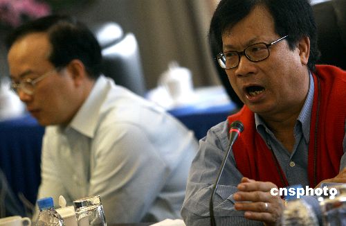 三月十四日,参加十届全国人大五次会议的香港代表团审议“两高”报告。图为全国人大代表、香港工联会会长郑耀棠在会议上发言。中新社发 刘新 摄