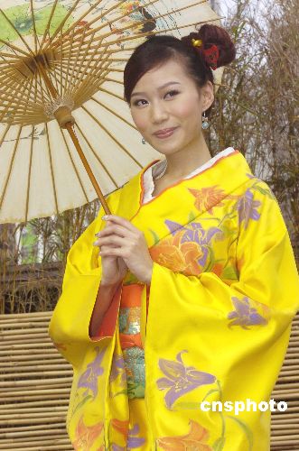 3月15日,香港艺员陈文静在香港维园出席《万花争妍庆回归》摄影比赛,她穿着日本和服为活动担任摄影比赛模特。中新社发 邓庆乐 摄