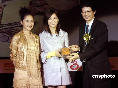 3月21日,《香港音乐汇展》在香港会展举行开幕礼。国际唱片业协会(香港会)主席洪迪向香港乐坛组合Twins颁赠纪念品。中新社发 邓庆乐 摄