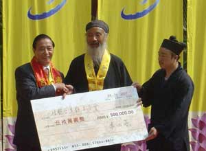 中新网4月25日电 据香港大公报报道,国际道德经论坛开幕两天,二十四日,在西安举行的楼观台修复落成大典上,李兆基再次捐出五十万元,任法融道长亲自为他祈福并为他颁发了功德证书。
