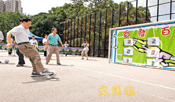 曾荫权又不忘为政府大卖广告,指康文署现正在全港18区推广三人足球,参加人数亦已高达1万人。他说:“我觉得这项运动很值得在香港推广,因为它没有太多限制,规则简单,场地要求亦十分灵活,球员组合可以有佷多变化,精力充沛的年轻人固然适合,连儿童亦可以参与,父母与子女更可以组成亲子队,是一项很好的合家欢运动。”