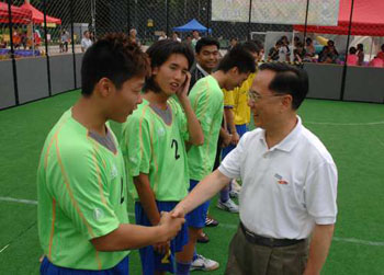 中新网7月31日电 香港特首曾荫权除了“号令”众高官走入群众外,自己还身体力行密密落区,并在个人网志大谈所见所闻。他在周日联同曾太观看黄大仙地区足球队的示范赛,更大赞紧张气氛不逊于早前利物浦决战朴茨茅夫。对于三人足球,曾荫权更是大力推介。