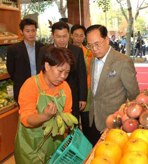 中新网1月8日电 香港新生精神康复会在愉景湾开设的第五间“新生农社”7日举行开幕礼,香港特首曾荫权席并听取职员介绍该处售卖的有机食品。