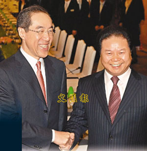 香港政务司司长唐英年与广东省常务副省长汤炳权握手。 来源:文汇报