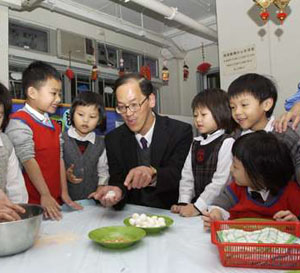 因应该会庆祝三十五周年,曾德成特别送上一个大蛋糕,幼儿园内的小朋友见到局长到来,也非常高兴,十多名小朋友热情地与曾德成一起制作爱心汤圆,并品尝小朋友亲手造的爱心汤团,分外喜悦。